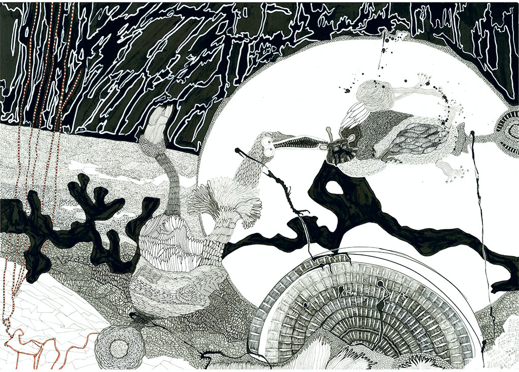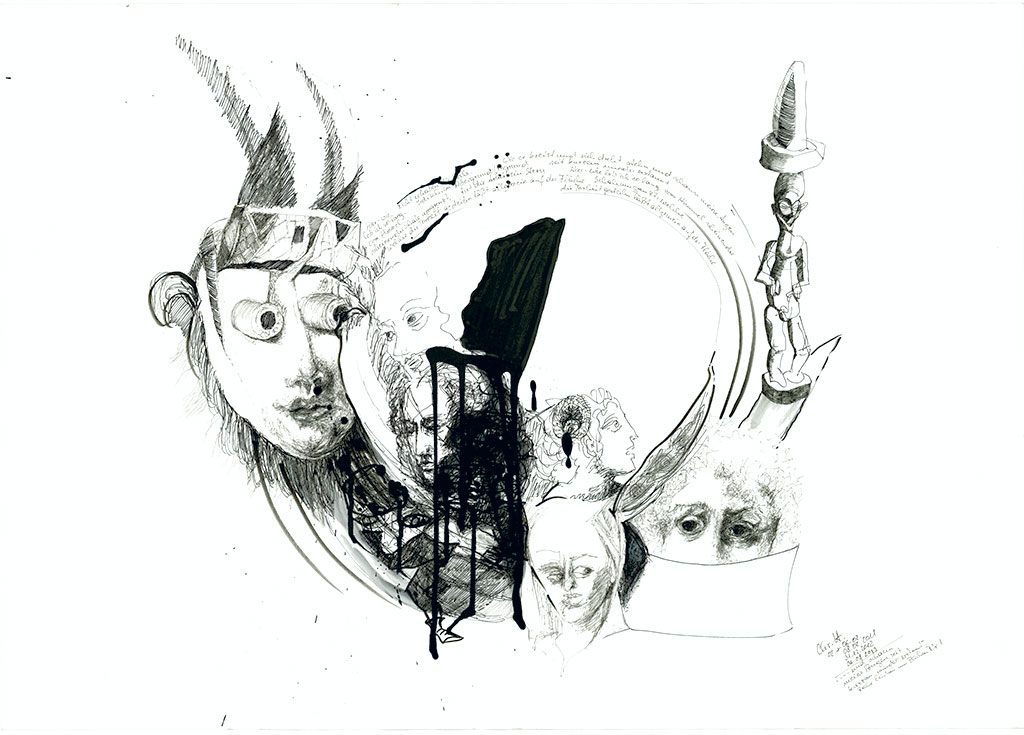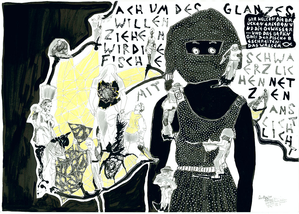 Aus der Reihe „Torheit auf der Fläche“ 2012-13 , Arbeiten zur Lyrik von Ernst Meister, Zeichnung/Hochdruck/Collage, Tusche, Pigmentstifte auf Zeichenkarton, Architekturpapier, 59,5 x 84 cm